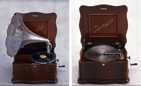 写真:1910年頃にアメリカのレジーナ社で作られたディスク・オルゴールと蓄音機の兼用機『レジーナフォン 155 型』。ホーンとターンテーブルを外すとディスク・オルゴールの演奏も行えます。コンサートではこの他に1925年頃にイギリスのグラモフォン社で作られた『HMV 卓上型 103型』も使用します。