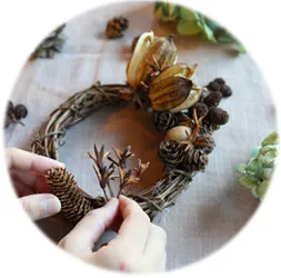 蓄音機コンサート終了後は六甲高山植物園の植栽スタッフの指導により、六甲山上でとれた自然素材などを使って、クリスマスミニリース作りも行います。