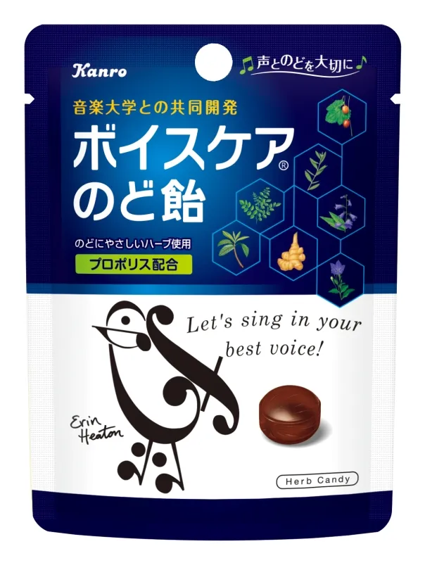 カンロが国立音楽大学の声楽科の教授監修のもと、学生の声を聞きながら開発期間3年、60回もの試作を繰り返してつくり上げた「声とのどを大切にする人」のためののど飴です。プロポリスとのどにやさしい7種のハーブを配合し、ほどよいメントール感のある味わいで、発売以来、声とのどを大切にする沢山の方々にご愛顧いただいています。