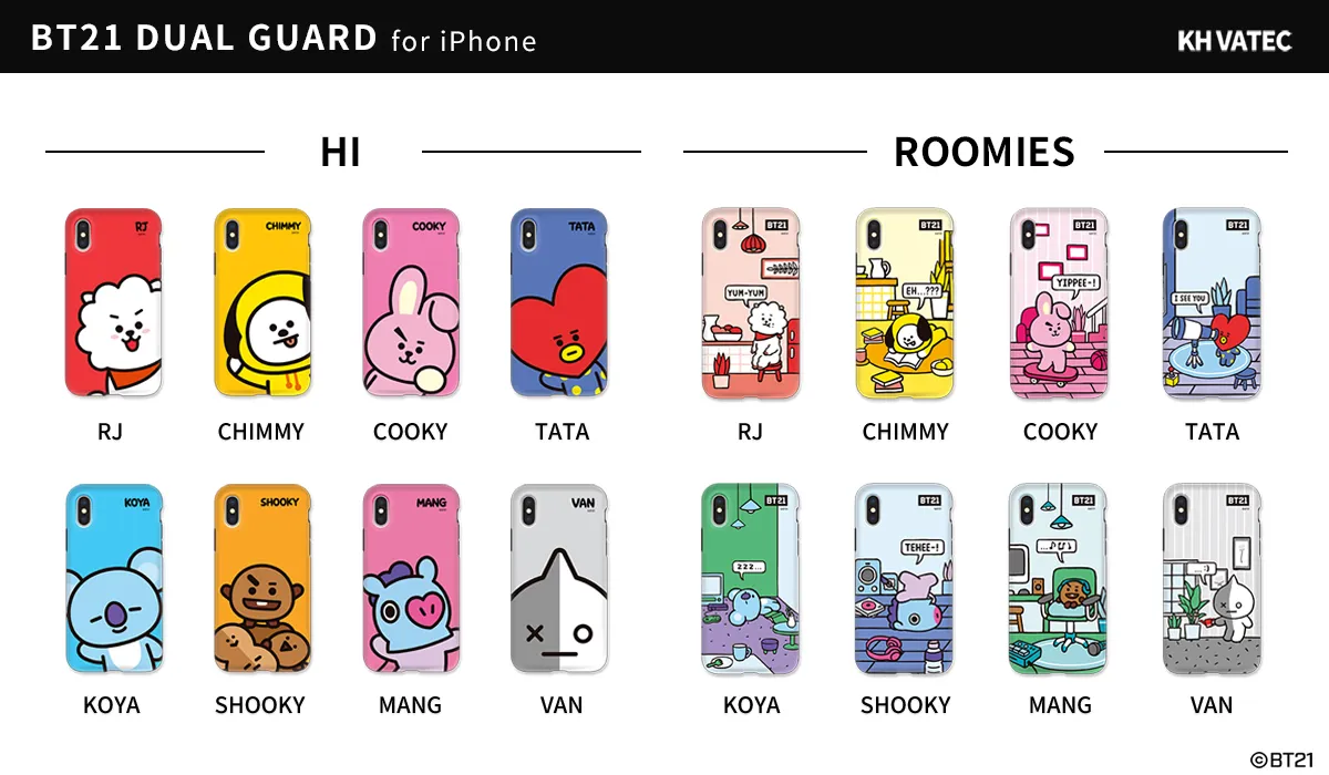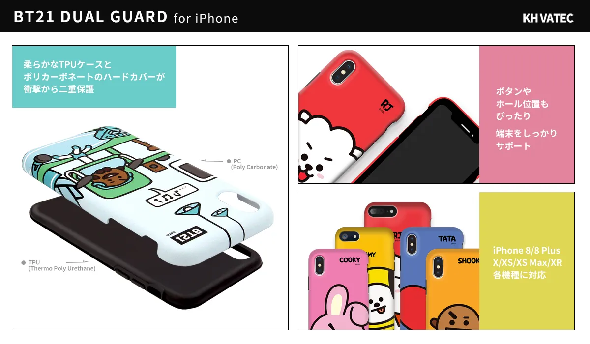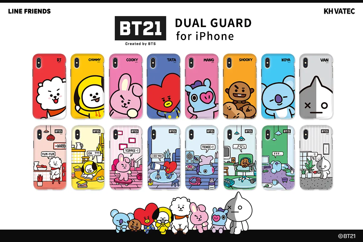 モバイル周辺アクセサリー専門の株式会社ロア・インターナショナル(所在地:東京都新宿区、代表取締役社長:Ally Won)は、KH VATEC社のBT21公式ライセンス商品から、BT21の可愛いキャラクターがデザインされた、iPhone XS / XS Max / XR(5.8インチ、6.5インチ、6.1インチ)専用のケース「DUAL GUARD(デュアル ガード)」を販売開始しました。
