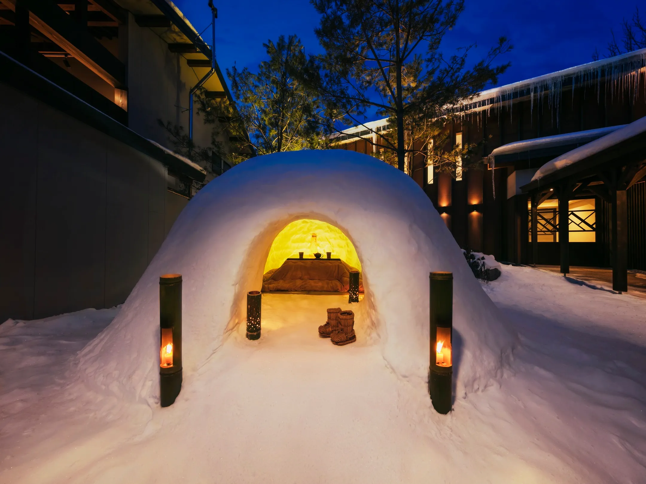 冬の時期は中庭にかまくらが登場します。天然の冷蔵庫、雪室で冷やした地酒をかまくらの中で楽しめます。