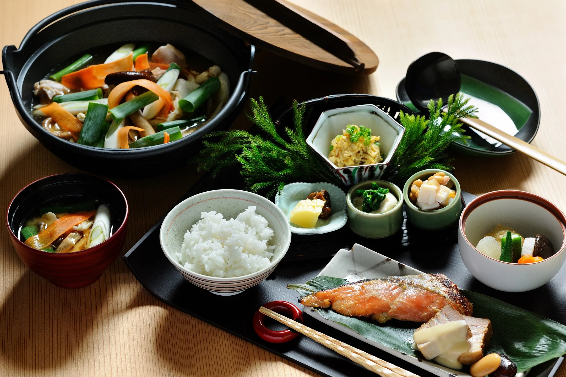 大町が日本海と内陸を結ぶ交易路「塩の道」の宿場町だったことから、塩を内陸へ運ぶため重宝された「塩丸いか」が入った煮付けや、キノコたっぷりの味噌汁など海の幸・山の幸を盛り込んだ朝食を用意します。