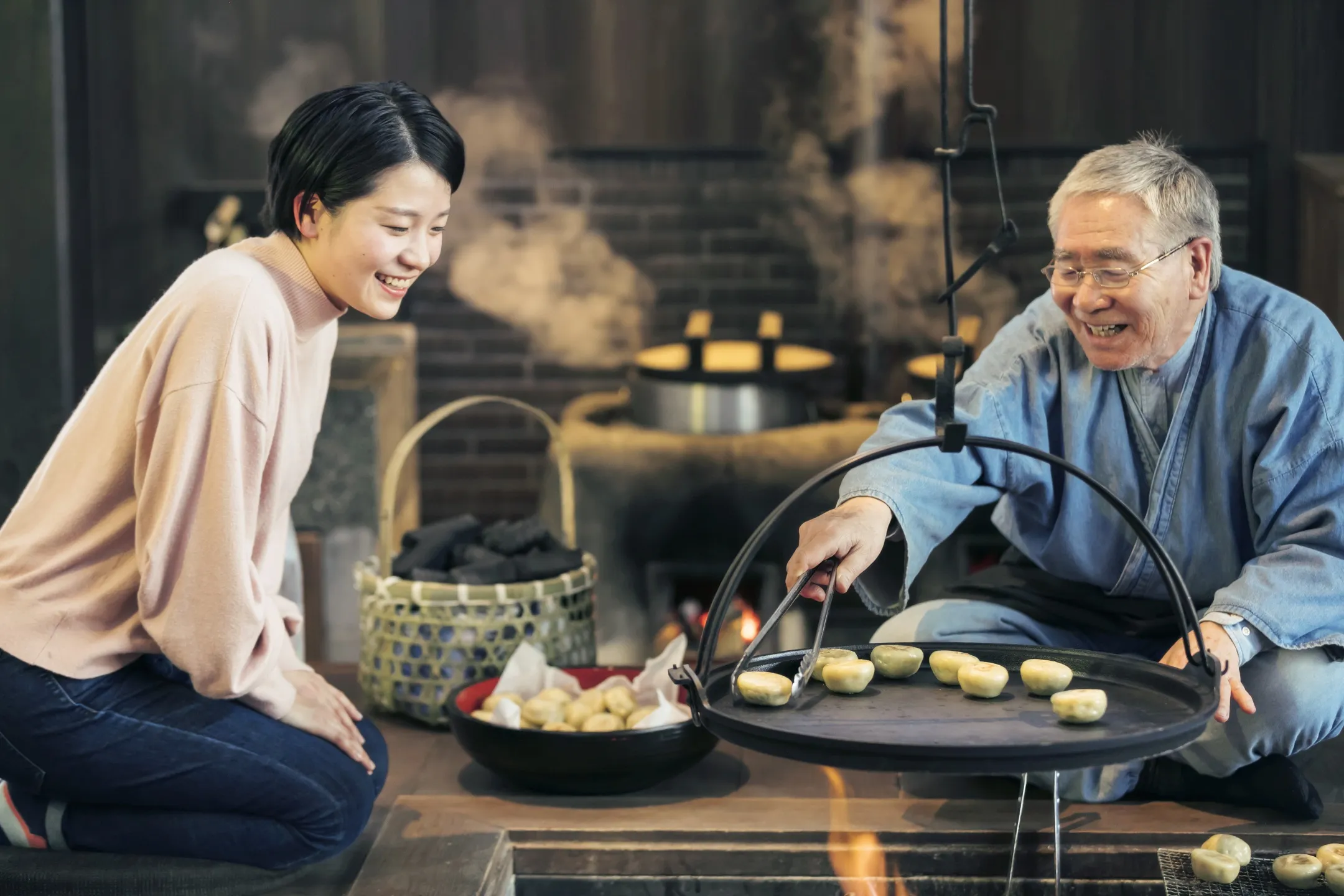15:30 ご当地楽を体験、囲炉裏で焼き立てのおやきを味わう