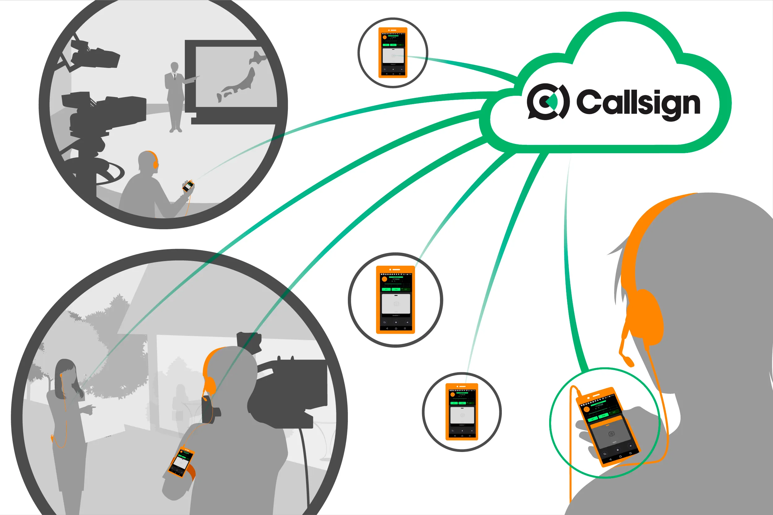 「Callsign」は、これまで放送業界へのソリューション提供で培ってきたノウハウをもとに、ソニービジネスソリューションが独自に開発したスマートフォン用インカムアプリです。業務用インカムとして必要な機能や品質を備えており、放送局をはじめとして、空港、イベント管理、警備、介護、運輸、大規模店舗での情報伝達など、さまざまなシーンでの活用を想定しています。