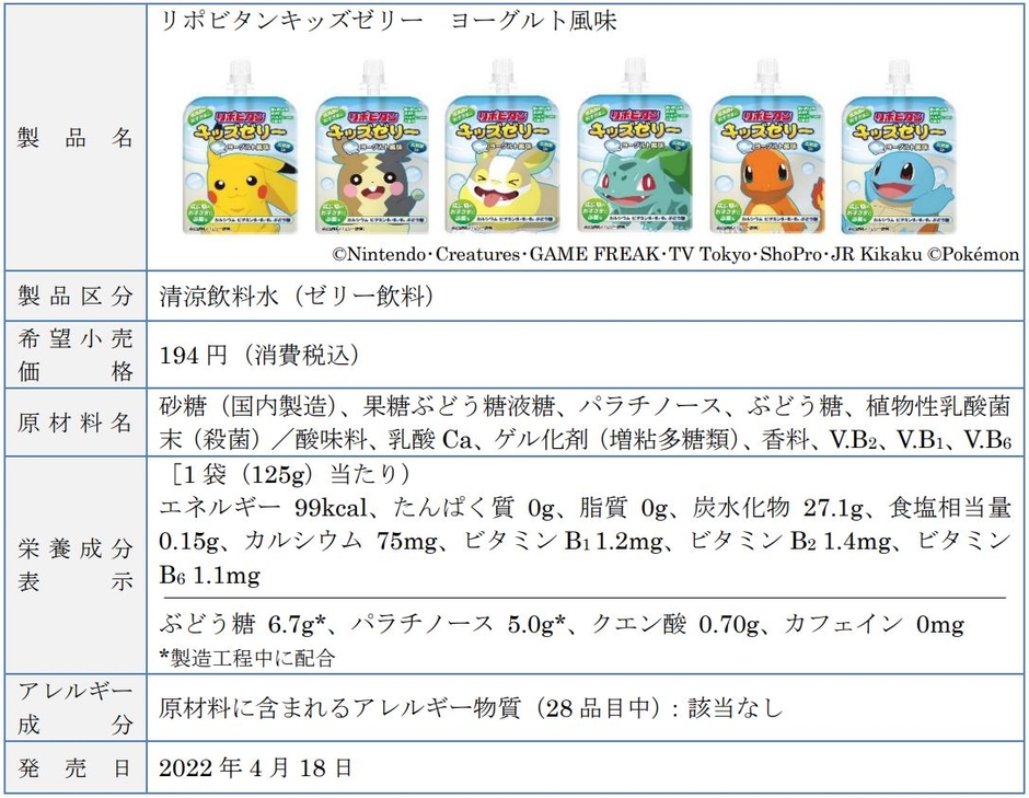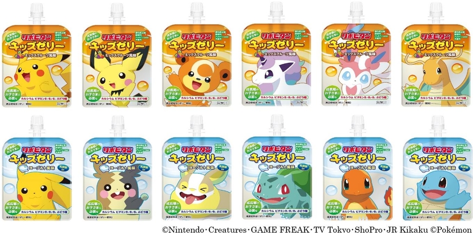 ポケモンがデザインされた4種のリポビタンキッズゼリーが、お子さまの健やかな成長を応援してまいります。