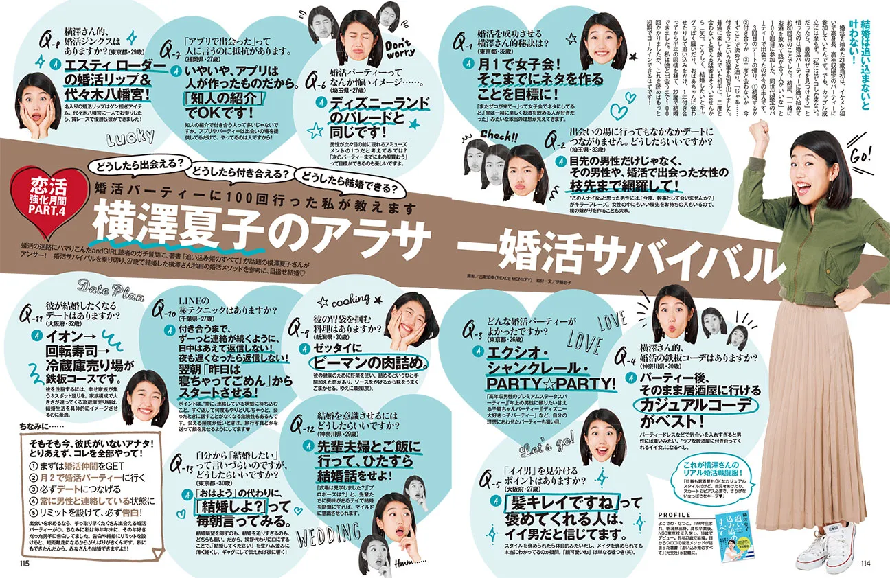 婚活の迷路にハマりこんだandGIRL読者のガチ質問に、著書『追い込み婚のすべて』が話題の横澤夏子さんがアンサー!婚活サバイバルを乗り切り、27歳で結婚した横澤さん独自の婚活メソッドを参考に、目指せ結婚!