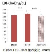 同条件のB群の被験者(n=2)では総コレステロールは摂取前から摂取後に減少傾向が見られ、LDLコレステロールは摂取前から摂取後に有意に改善し、またHDLコレステロールの変化はみられませんでしたが、LDL/HDL比に摂取前から摂取後への減少傾向にありました。