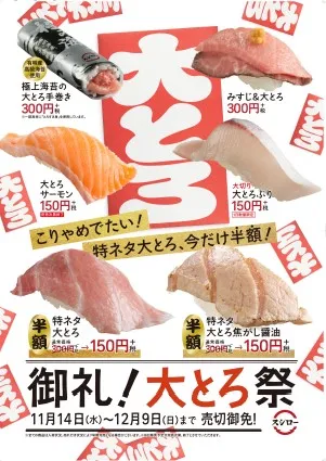 株式会社あきんどスシロー(本社:大阪府吹田市、代表取締役社長:水留 浩一)は11月14日(水)より、「御礼!大とろ祭」の商品として、200kg超えの本まぐろを使用した感動の『特ネタ大とろ』を、お値打ち価格の150円(+税)にて全国のスシローで期間限定販売いたします。