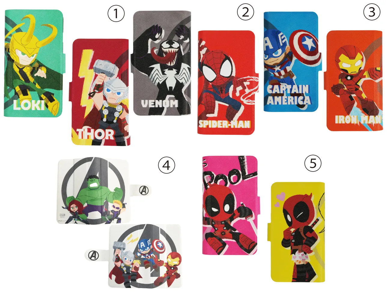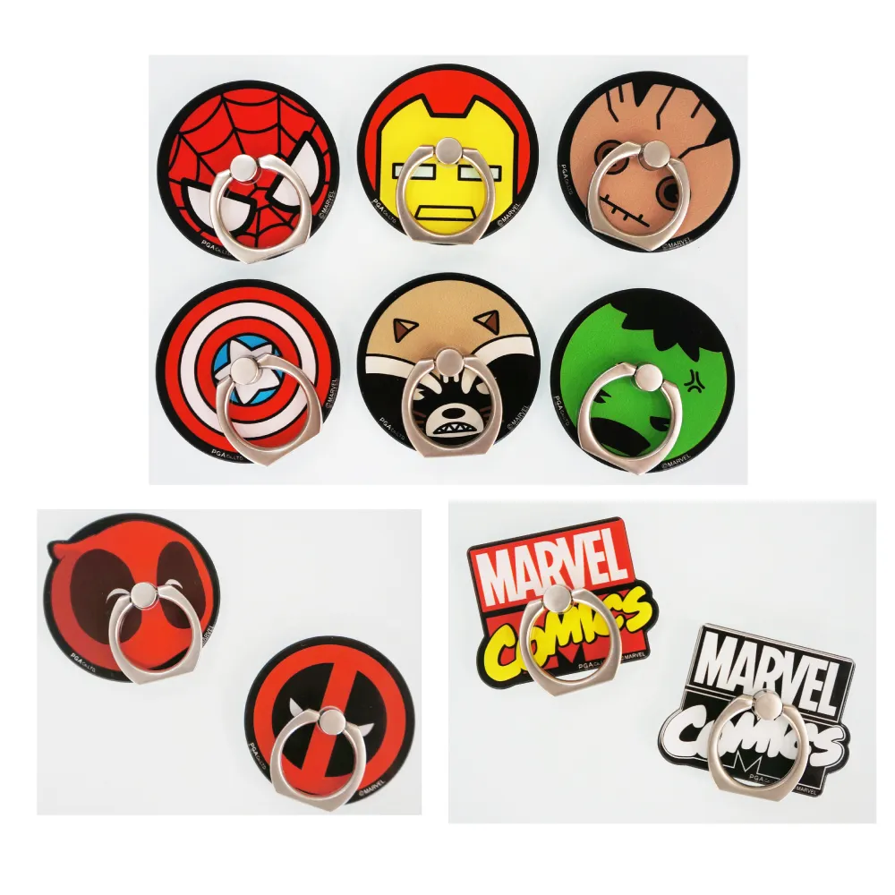 商品特徴:キャラクターのポップなデザインの丸型リングと「MARVEL COMICS」ロゴのダイカットリングの2種類です。リングを立ててスタンドとしても使用できます。