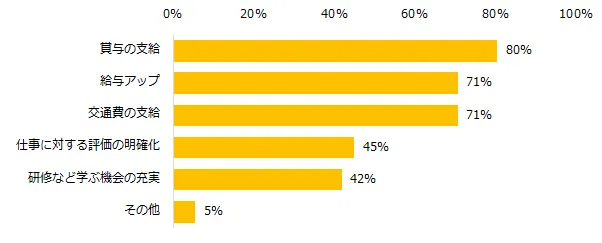 第2位は「給与アップ」(71%)でした。『給与が上がれば、働くモチベーションにつながる。もっと給与を上げるために、社内外の勉強会にも積極的にでるようになると思う』(25歳女性)、『給与の格差が埋まれば、正社員の方に感じる壁もなくなると思う』(34歳女性)といった声が挙がりました。