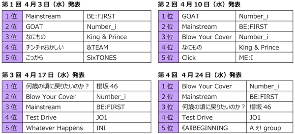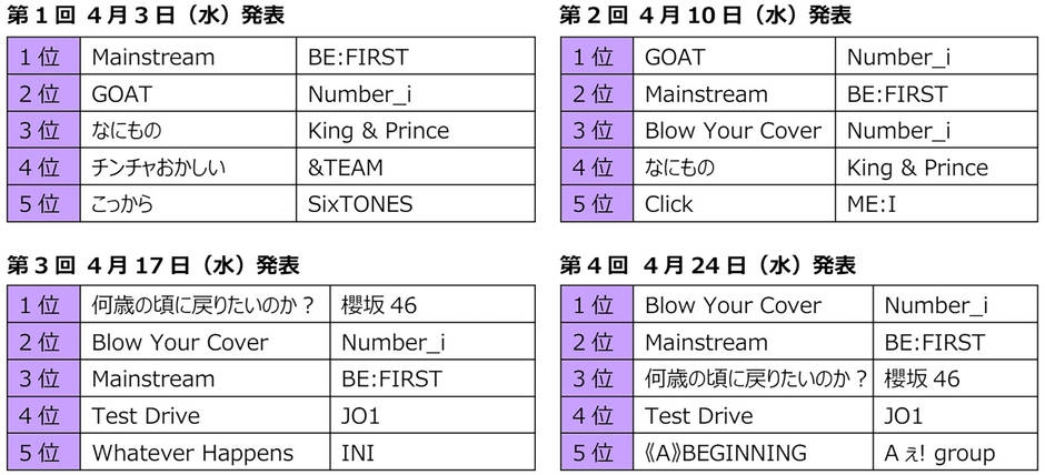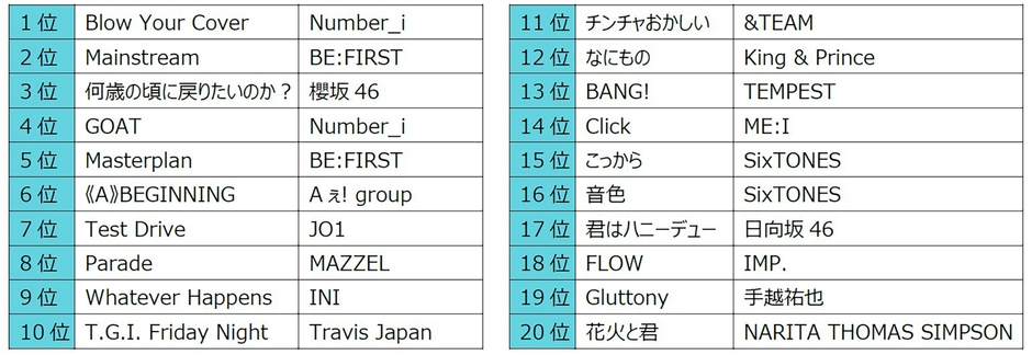 第1回「マンスリーランキング」の初代1位は、毎週1位のアーティストが入れ替わる混戦を制して、見事Number_iの「Blow Your Cover」が記録しました。そしてデビューシングル「GOAT」も4位にランクインするなど好成績な結果となりました。
