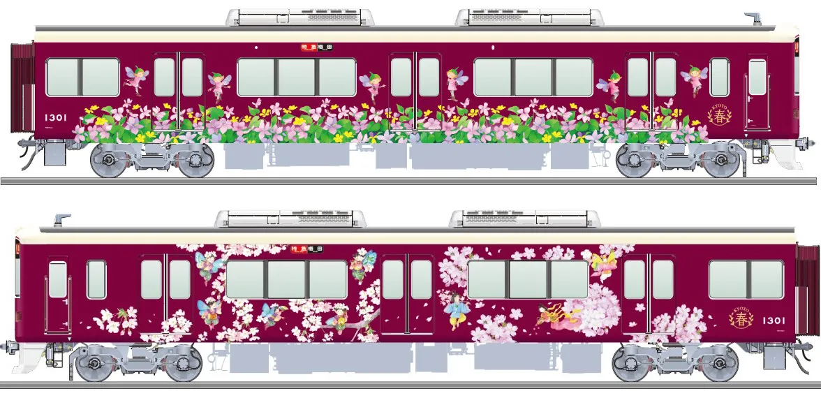 車両の両面を異なるデザインとするのは初めての試みであり、永田萠さんの描く「花と妖精」が京都の観光スポットへと誘います。