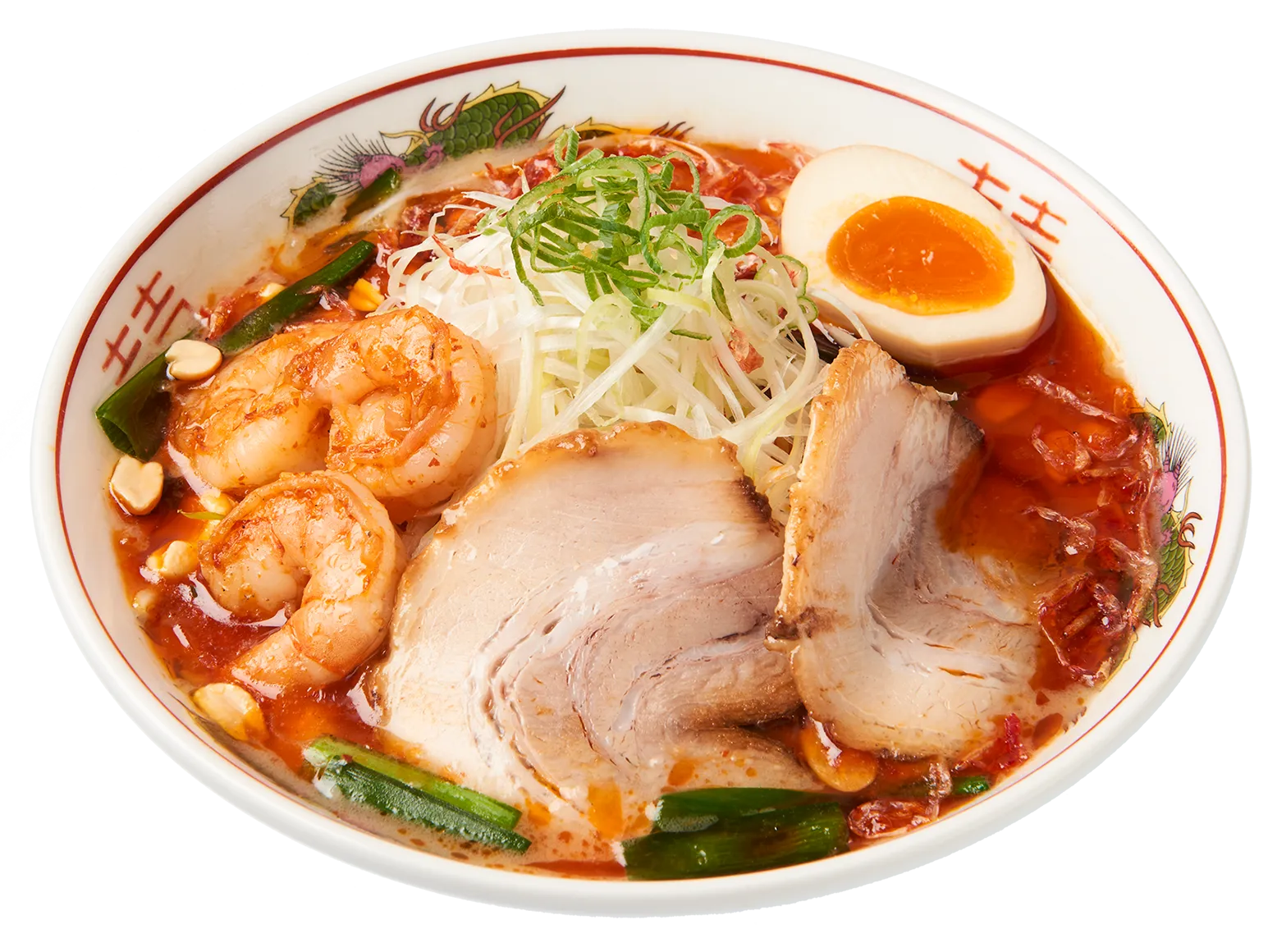 豚骨スープに合うように調合したスパイスと こだわりの海老油がポイントです。プリプリの海老、カリカリのナッツの食感、そして本場中国の風味を楽しめます。