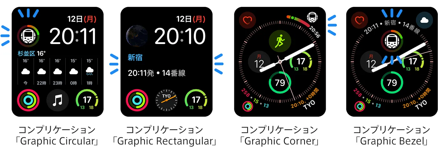 「Apple Watch Series 4」より新たに追加された4種類のコンプリケーション(Apple Watchの文字盤にアプリの情報を表示する機能)に対応します。利用者の好みにあわせた文字盤デザインを実現します。