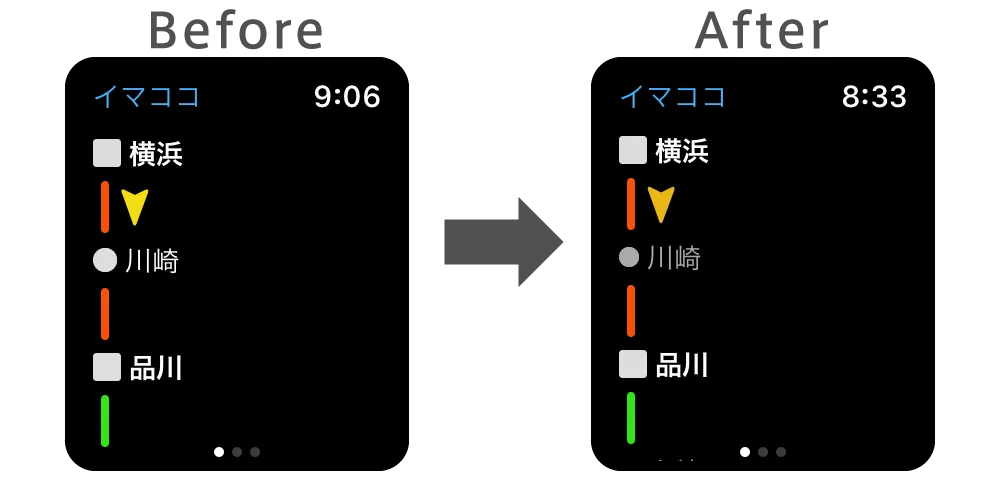 乗車中に自分が今どの駅間にいるのかを確認することができる「イマココ」機能の画面デザインを改善します。降車しない途中駅と、乗り換えが発生する乗り換え駅の差や、現在地をより明確化したデザインにしています。