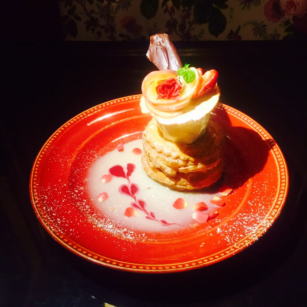 スタードのソース、焼きたてのアップルパイと共に、お皿には食用のバラをあしらい女の子らしさを。