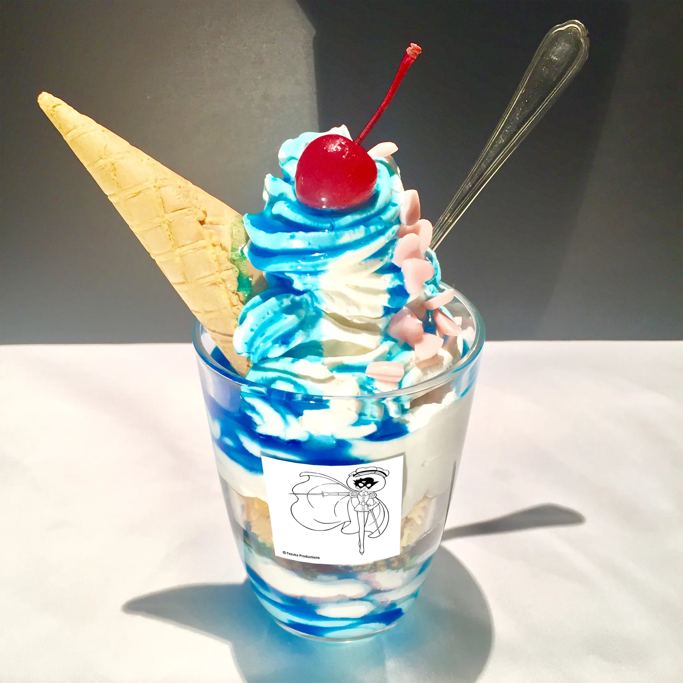 自家製パンナコッタや、バニラアイスなどを重ねて、サファイアをプリントしたオリジナルマカロンをトッピングしたtables cook &jonathan’s bookstoreだけの限定メニュー。