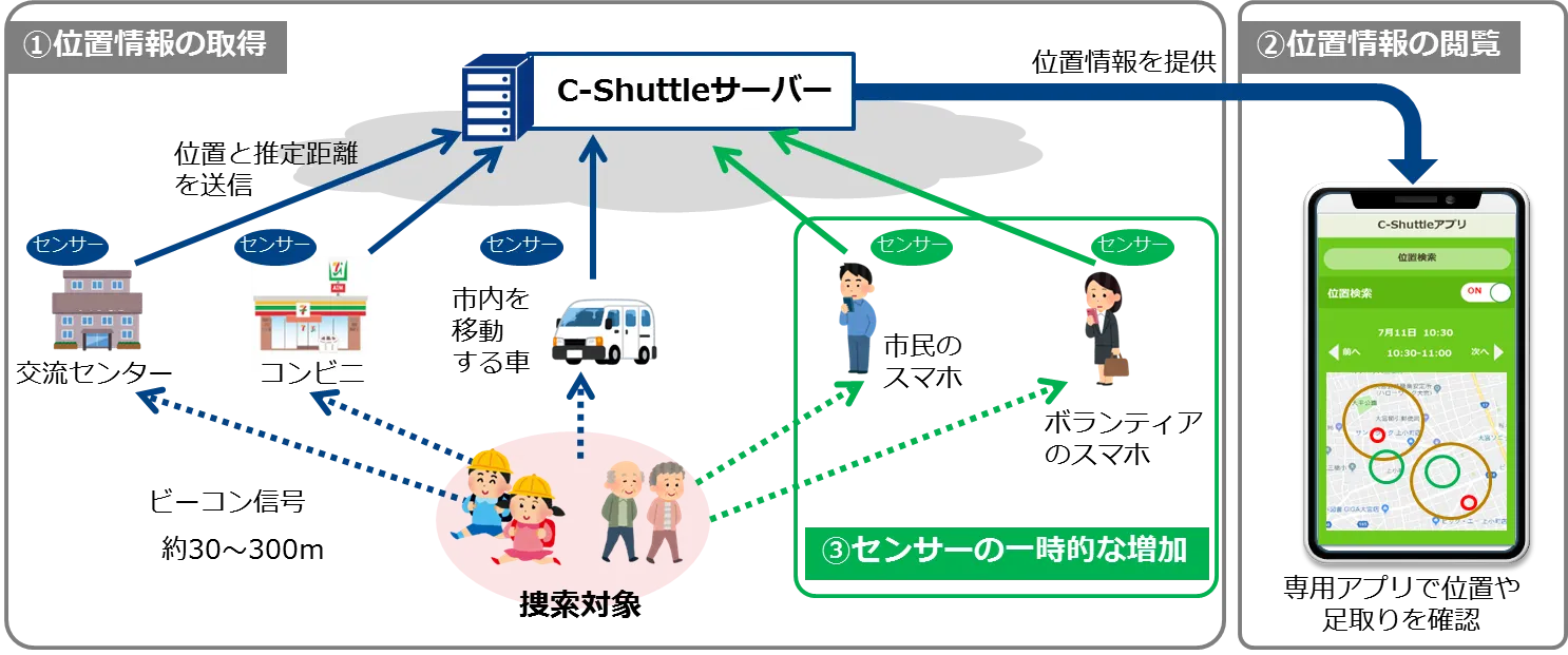 子どもや高齢者が携帯するビーコンから送信された信号を、付近にあるセンサーがキャッチし、センサーの位置情報と、受信した信号の種別を「C-Shuttle」サーバーに送信します。