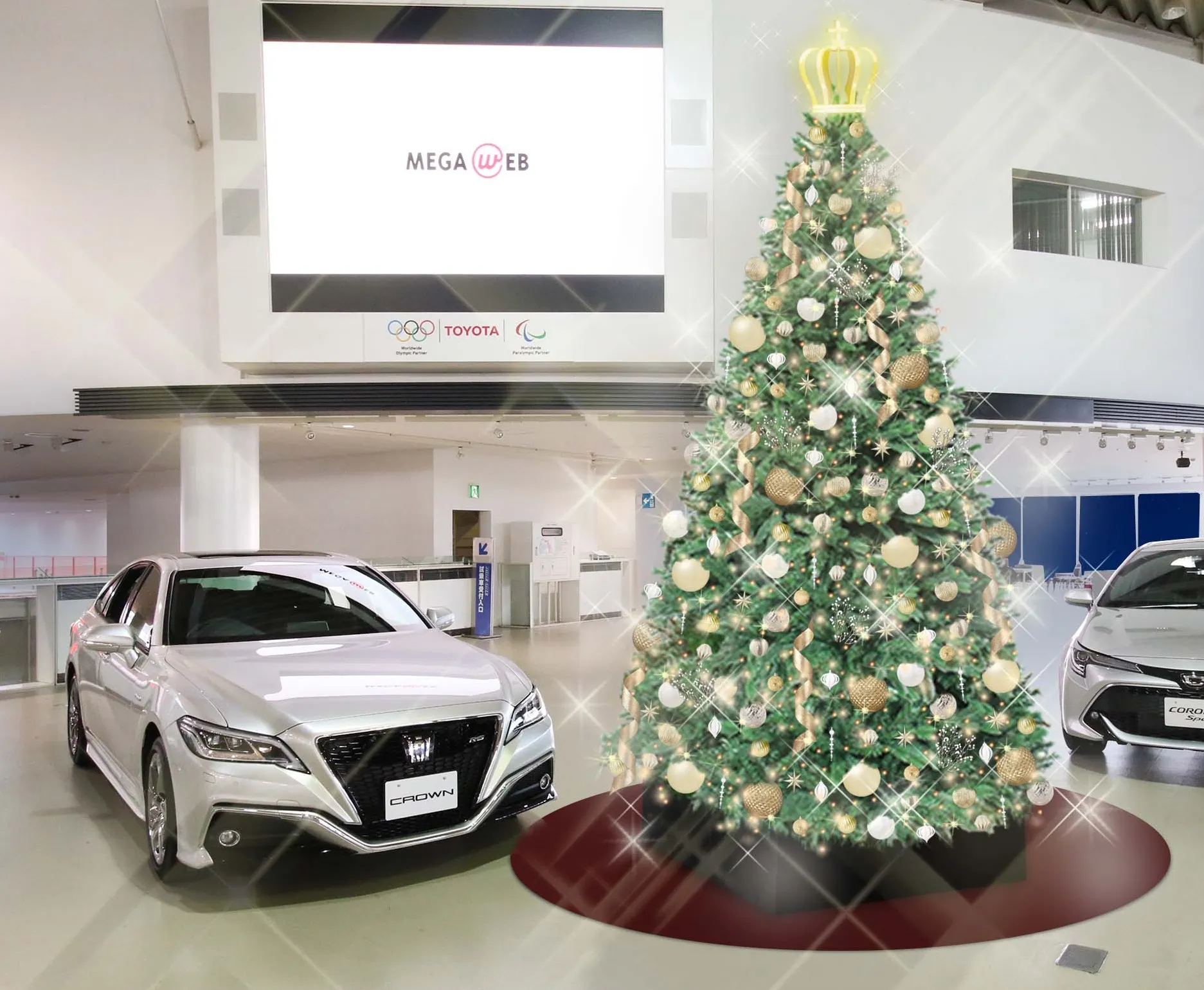 初代コネクティッドカー「クラウン」をイメージした“王冠”をツリートップに添えた、きらびやかなメインツリーを車両と共に展示します。シャンパンゴールドのオーナメントとイルミネーションを施したツリーやリースを館内各所に設置し、クリスマス気分を盛り上げます。