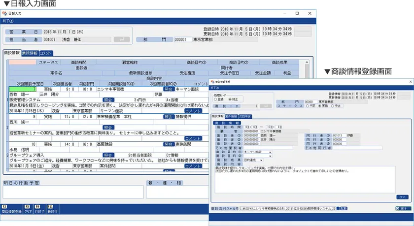『SMILE V テンプレート 顧客創造日報』は、国内有数の導入実績を誇るSFAシステム「顧客創造日報」の開発元であるNIコンサルティング社とのタッグにより、日報入力を中心に、顧客・商談・案件情報のトータルな管理を実現したSFAシステムです。「SMILE V 販売」の得意先や担当者等のマスターデータを利用することで入力の手間を削減し、SMILE Vならではの検索・集計機能により、部門別、担当者別、月別、顧客別、ランク別など、さまざまな角度でデータ分析を行うことが可能です。
