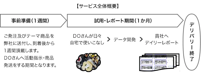 本サービスは商品を生活の中で徹底的に使い込んで、今まであまり見えていなかった小さな満足が得られた場面のユーザー体験を、いち早くお届けいたします。また、活動人数(データー)の追加やアイデアラッシュワーク実施などのオプションの追加も可能です。