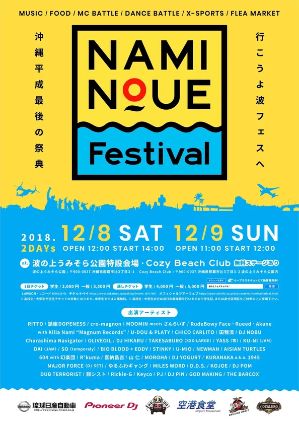 両サイドに突き出した岬を利用して、左側のうみそら公園にNAMI STAGE、右側のCozy Beach ClubにCozy STAGE、中央(CENTER BACK)の海中道路陸橋下に入場無料の3つのステージを設置し、県内から勢いが止まらないヒップホップ、レゲエ、ポップス、ロック、民謡、などなどさまざまなフィールドで活躍するバンド、ラッパー、DJが登場!県外からも初来沖のアーティスト&フェスでお馴染みの豪華ゲストが出演決定しています。