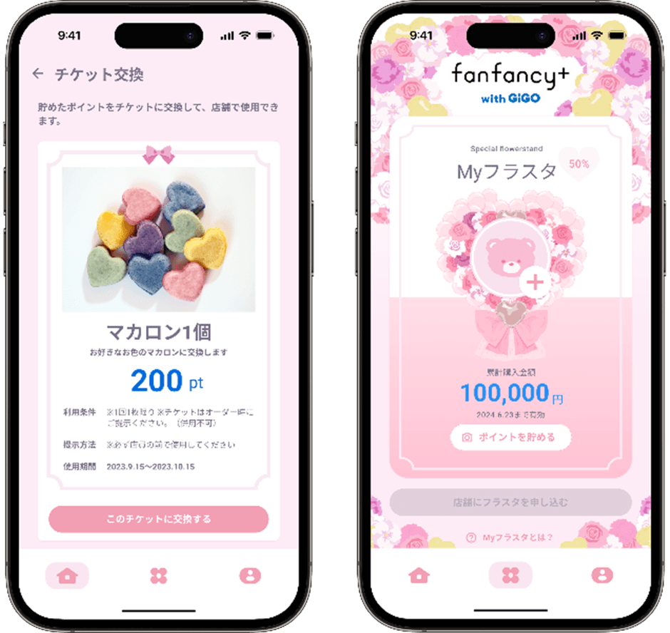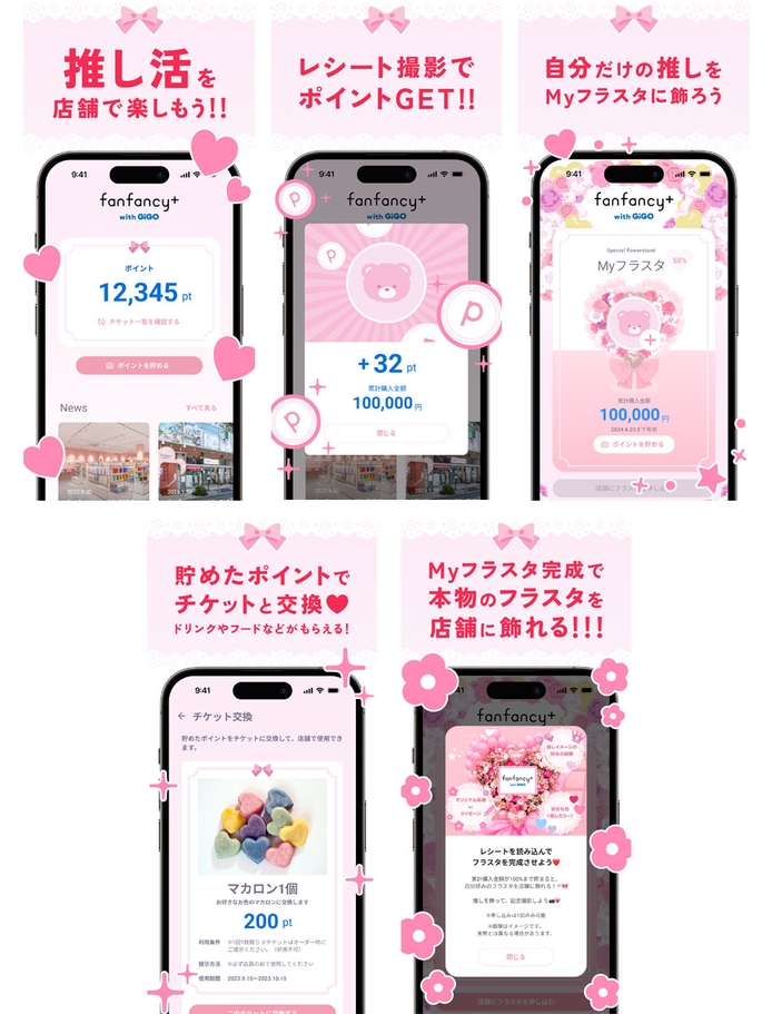 このたび、同ショップをさらに楽しくお得にご利用いただける公式アプリ「fanfancy+ with GiGO」をリリースいたします。「fanfancy+ with GiGO」にてご購入いただいた金額に応じてポイントを貯めることができ、店舗にてドリンクやフードと交換できるチケットを付与するなどの特典をご用意しております。また、アプリ内にはデジタルフラワースタンド機能を搭載しており、購入金額が増えると装飾も増えるかわいいデザインとなっております。更に、一定の購入金額を達成しデジタルフラワースタンドを完成させると本物のフラワースタンドを店舗に設置することが可能です。デジタルフラワースタンド内にはお好きな画像をアップロードできますので、ぜひご活用ください。※著作権を侵害するような画像のアップロードはお控えください。