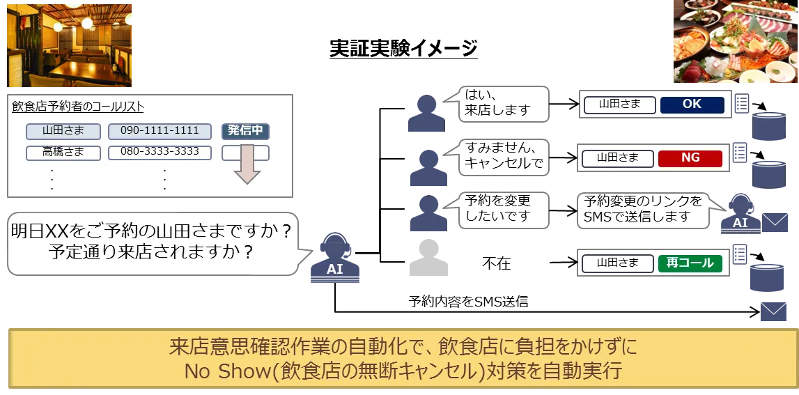 AIがSMSや電話によりリマインドを自動実行し、飲食店予約者に予約内容を再確認します。飲食店予約者との応対結果に応じて、予約変更システムへの誘導などの、事務作業をRPAが自動で実行します。これによって、飲食店の従業員に負担をかけない大量の予約確認業務を実現するとともに、飲食店予約者の利便性も向上できる環境を目指します。