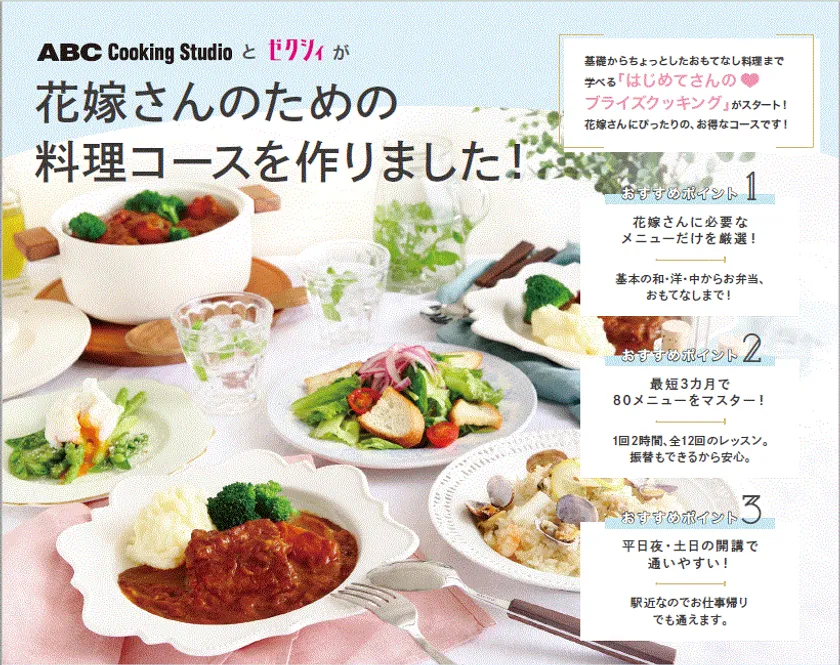 ABCクッキングスタジオ×ゼクシィで ブライダル特別企画を実施! 花嫁のみなさまが“本当に習いたいメニュー”を3か月で学べる 「クッキングコース」が誕生
