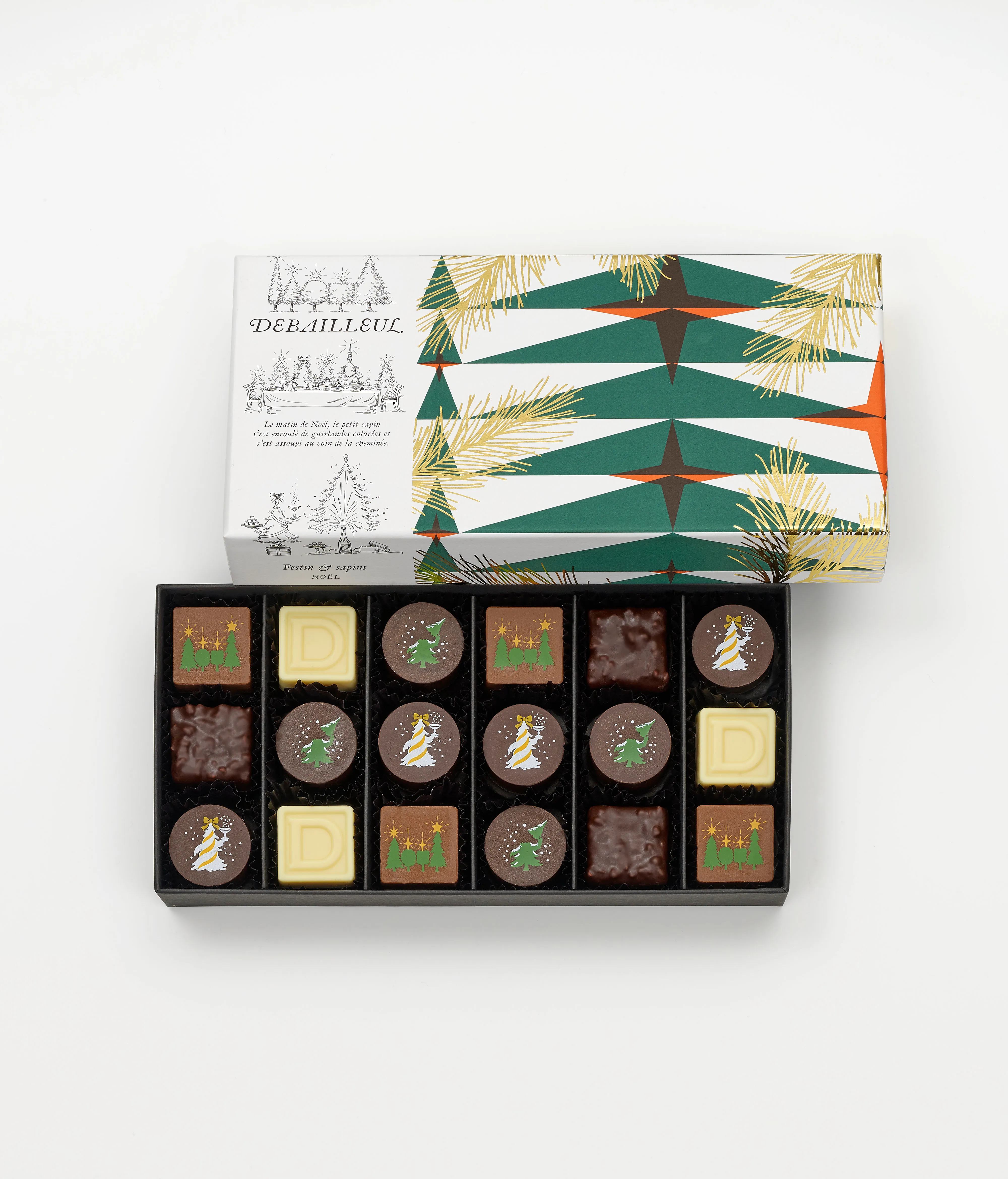 2018年クリスマスにドゥバイヨルが贈るスペシャル アソルティのテーマは、“モミの木たちの饗宴”です。クリスマスの夜、モミの木の家族が集まり、美味しいご馳走やシャンパンを楽しむ様子を描いたドゥバイヨルらしいユニークなイラストと、色鮮やかなクリスマスツリーを表現したパターン柄が印象的なパッケージです。季節限定ショコラ3種と人気の定番ショコラ2種を贅沢に詰合せた、この季節にぴったりの華やかなギフトボックスです。