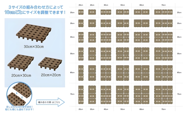 『20×20cm・20×30cm・30×30cm』の組み合わせ方によって10cmごとにサイズを調整できるので、広く全面に敷いて使用したり、必要な所にだけ敷いて使用したりとスペースや収納物に合わせてサイズを調整することができます。