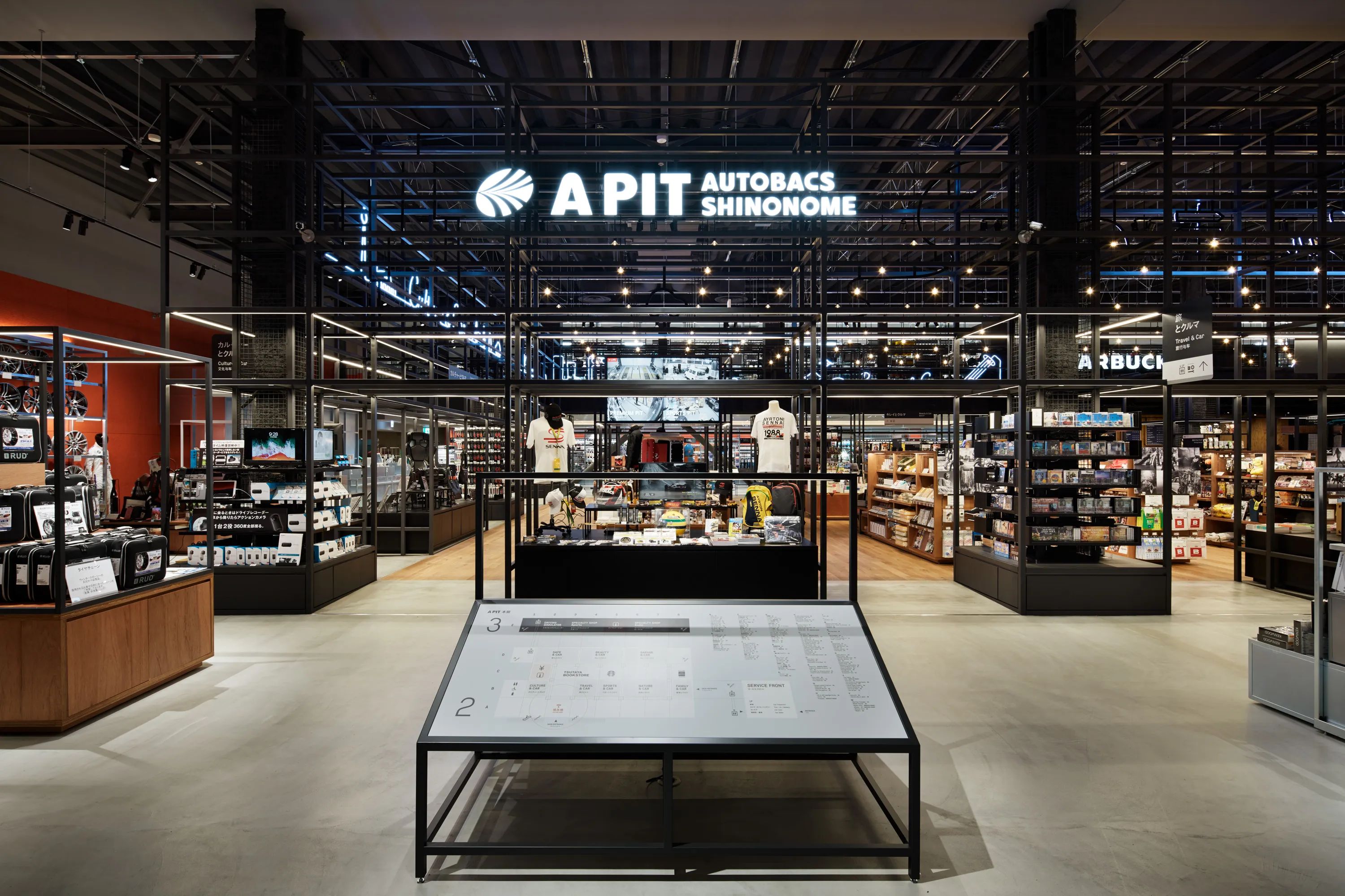 フロア中央には、カーライフ(=クルマがあることでもっと楽しく・豊かになる生活)を提案する「BOOK & CAFE」スタイルの書店「TSUTAYA BOOKSTORE 東雲」が誕生。A PIT AUTOBACS SHINONOMEが新しく打ち出す8つのライフスタイルテーマに合わせて書籍・雑誌・雑貨を展開します。ガレージライフや自動車カスタマイズなどのクルマ専門書籍・雑誌はもちろん、子どもたちのクルマへの好奇心を刺激する絵本や児童書、クルマで出かけたくなる旅行やアウトドアに関わる書籍・雑誌などを豊富に取りそろえています。