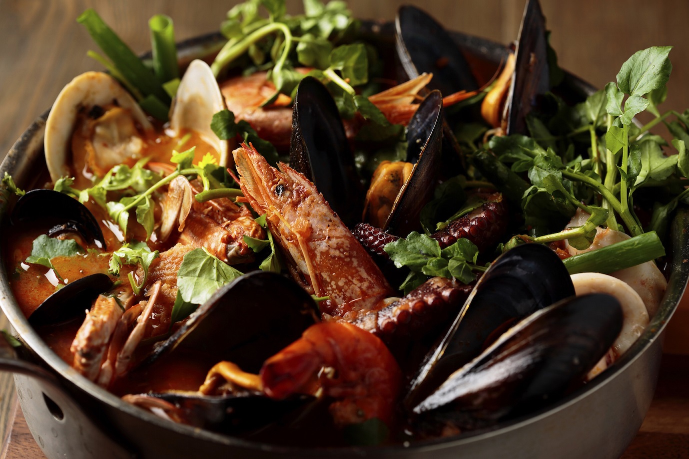 海老やムール貝、あさりなど約7種類の魚介と契約農家から直納の季節の野菜約5種類が入ったブイヤベースです。新鮮魚介と野菜の旨みが詰まった味わいは絶品です。
