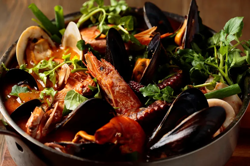 海老やムール貝、あさりなど約7種類の魚介と契約農家から直納の季節の野菜約5種類が入ったブイヤベースです。新鮮魚介と野菜の旨みが詰まった味わいは絶品です。