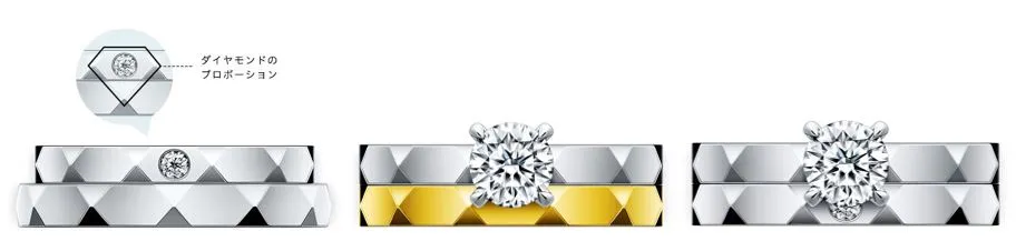 2本のリングを重ねてずらすとあらわれる「ダイヤモンドのプロポーション」の仕掛けも、ふたりを結ぶ証に。お揃いのデザインだからこそ見えるシークレットメッセージです。メレダイヤの有無、幅をお好みで選んであなたらしいコーディネートを。