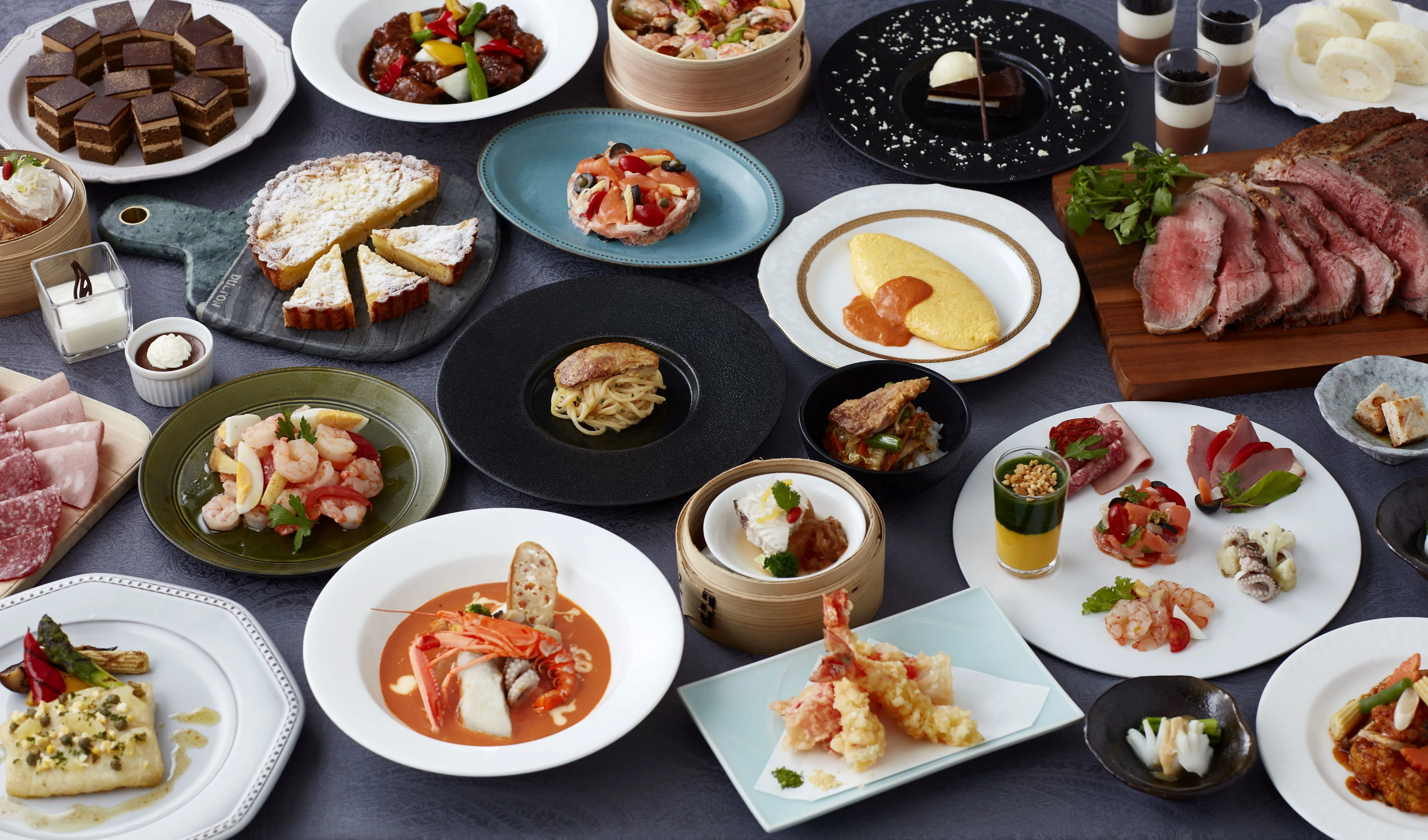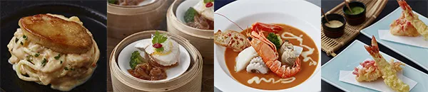 冬の食材や人気食材を取り入れ、新たな発見やアイデアが詰まった創作料理が多数登場いたします。 お客様の目の前で仕上げるエンターテインメント性の高い料理や、雪降るチョコレートスイーツなど和洋中の料理とデザート、ランチ約40種、ディナー約50種をビュッフェでお楽しみください。