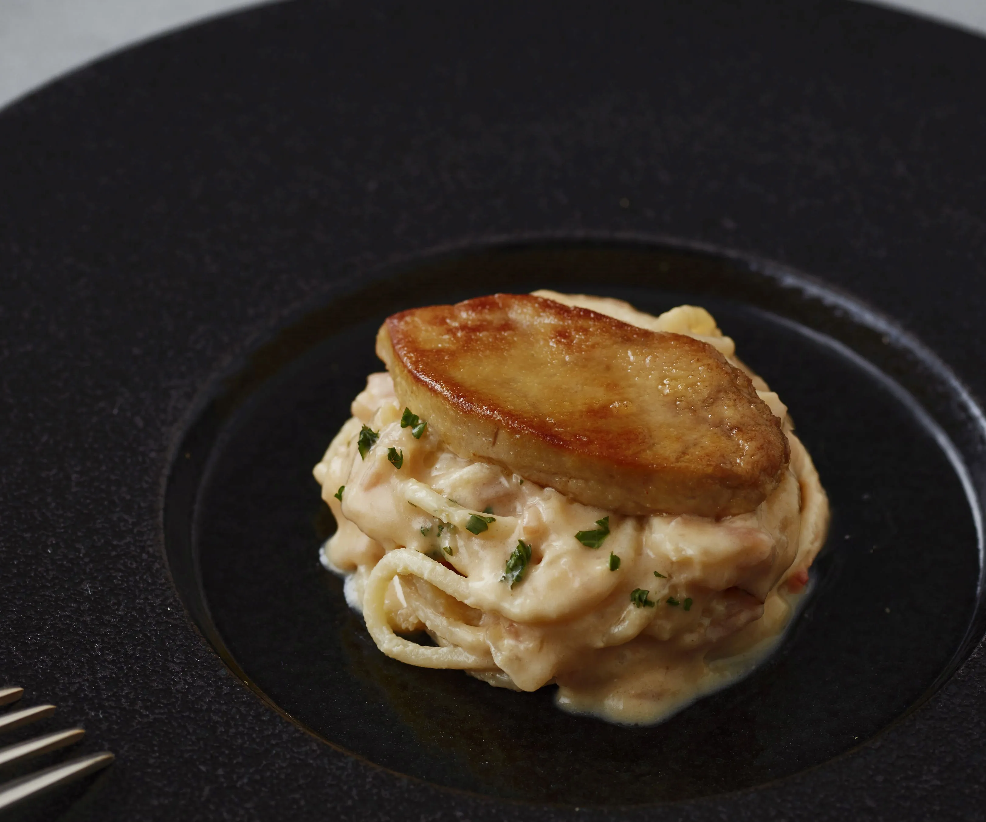 Point1.その名も「フォアボナーラ」チーズで絡ませる新しいフォアグラの和風カルボナーラ(画像1)