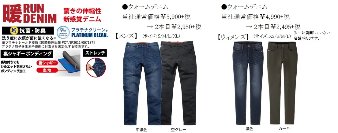 アンチピリング加工と静電防止加工を施した、「温°C・裏フリースボンディングパンツ」や、アクティブな方におすすめ、驚きの伸縮性新感覚デニムの「暖RUN DENIM」、デニムの定番、人気のEDWIN商品も特価で取り揃えています。2本目半額のこの機会に、家族まとめて揃えるチャンスです。
