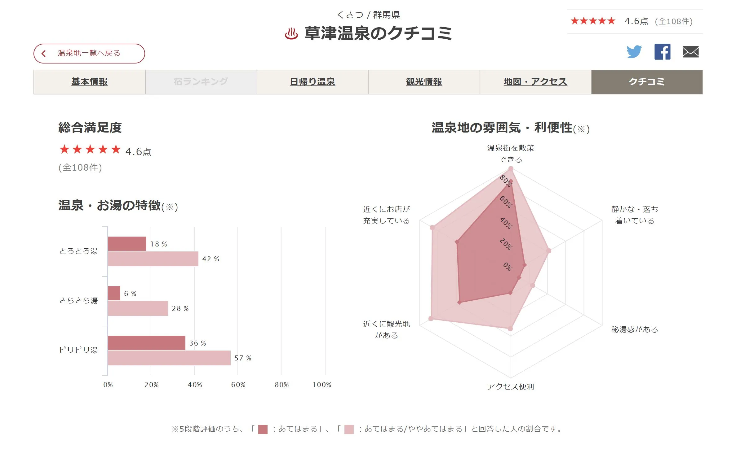 温泉・お湯の特徴や温泉地の雰囲気・利便性をグラフでわかりやすく表示