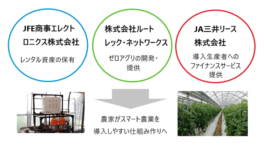 株式会社ルートレック・ネットワークス(代表取締役社長:佐々木 伸一、神奈川県川崎市)は、JA三井リース株式会社(代表取締役社長:古谷 周三、東京都中央区)と、JFE商事エレクトロニクス株式会社(代表取締役社長:轉 邦彦、東京都千代田区)と事業提携を行い、AI潅水施肥システム「ゼロアグリ」の定額利用プランを提供開始いたします。