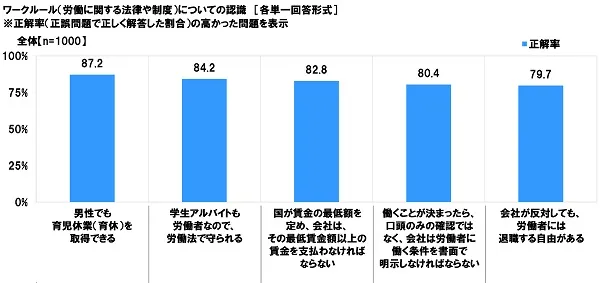 正誤問題(問題数15問)のうち、正解率が高くなったのは、「男性でも育児休業(育休)を取得できる」(87.2%)、次いで、「学生アルバイトも労働者なので、労働法で守られる」(84.2%)、「国が賃金の最低額を定め、会社は、その最低賃金額以上の賃金を支払わなければならない」(82.8%)、「働くことが決まったら、口頭のみの確認ではなく、会社は労働者に働く条件を書面で明示しなければならない」(80.4%)、「会社が反対しても、労働者には退職する自由がある」(79.7%)でした。男性も育休を取得できることについて、20代の約9割が理解していました。