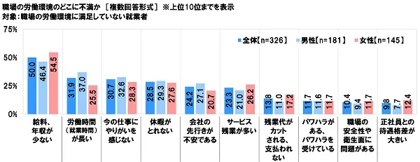 職場の労働環境に満足していない人(326名)に、職場の労働環境のどこに不満があるか聞いたところ、「給料、年収が少ない」が最も多く50.0%、次いで、「労働時間(就業時間)が長い」が31.9%、「今の仕事にやりがいを感じない」が30.7%、「休暇がとれない」が28.5%、「会社の先行きが不安である」が24.2%となりました。待遇面で不満を抱えている人が多いことがわかりました。