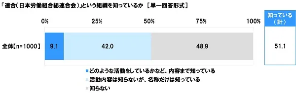 全回答者(1,000名)に、「連合(日本労働組合総連合会)」という組織を知っているか聞いたところ、「どのような活動をしているかなど、内容まで知っている」は9.1%、「活動内容は知らないが、名称だけは知っている」は42.0%で、合計した『知っている(計)』は51.1%となりました。