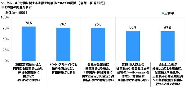 まず、全回答者(1,000名)に、ワークルール(労働に関する法律や制度)に関する正誤問題(クイズ)に解答してもらい、正しく解答した割合(正解率)をまとめました。
