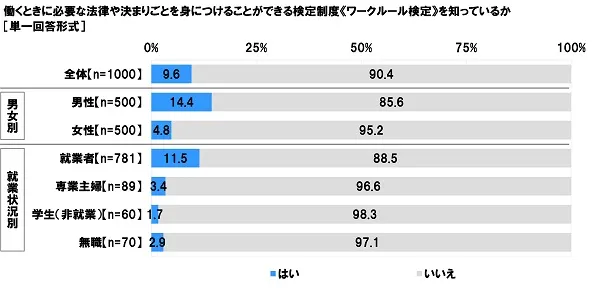 そこで、全回答者(1,000名)に、この《ワークルール検定》を知っているかどうか聞いたところ、「はい」は9.6%、「いいえ」は90.4%となりました。