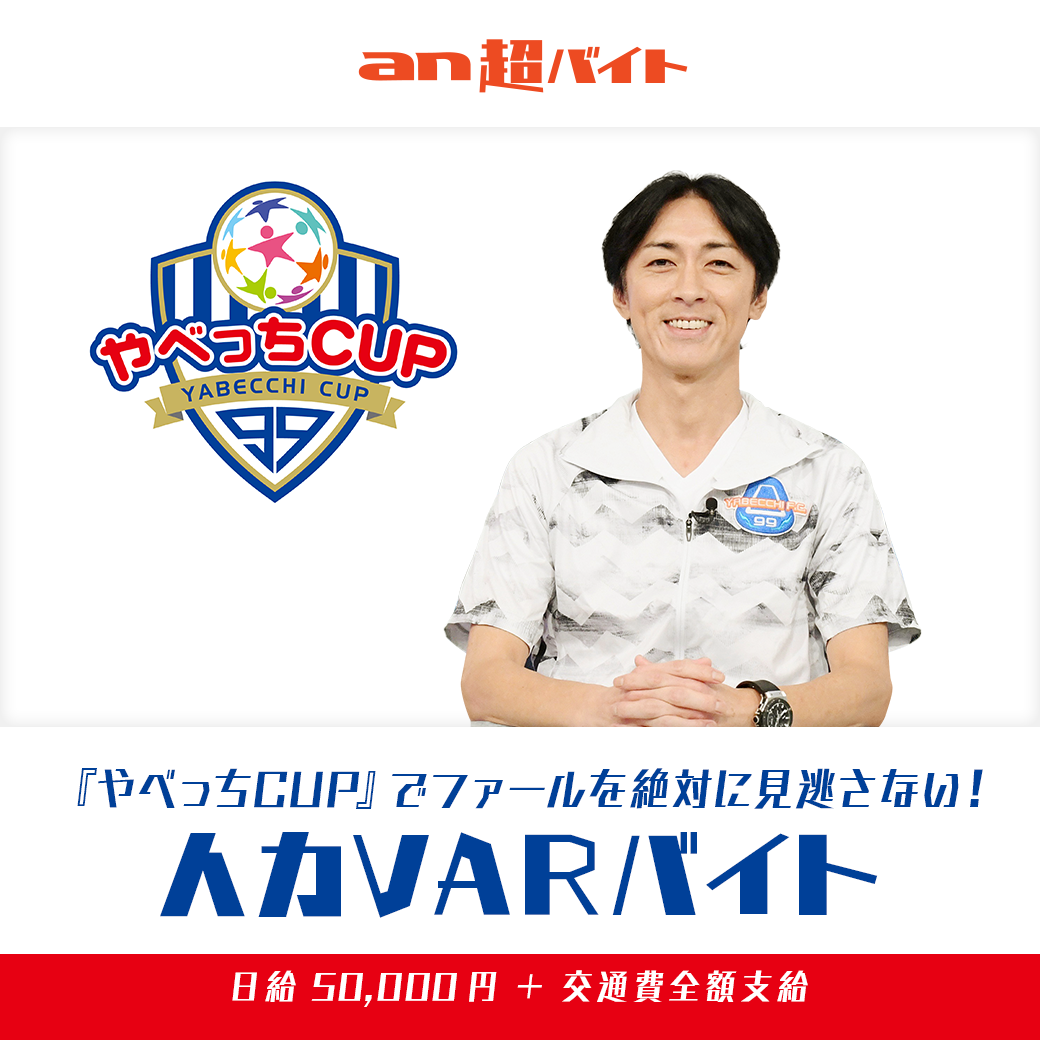 サッカー情報番組の司会を務め、大のサッカー好きとして知られるナインティナイン矢部浩之さんが主催する小学生対象のサッカー大会『やべっちCUP』が、「an超バイト」とスペシャルコラボ!ナインティナイン矢部さんはもちろん、元日本代表レジェンドや現役Jリーガー、サッカー好き芸人のゲストも多数参加する本大会で、ワールドカップでも話題となったサッカーの審判補助システム“VAR”の役割を人力で担っていただくバイトを募集します!