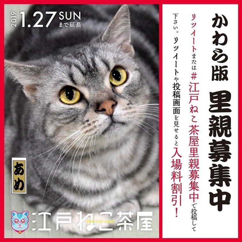 江戸ねこ茶屋製作委員会は、JR両国駅西口イベント広場「両国駅広小路」(東京都墨田区)で開催中の江戸版猫カフェ「江戸ねこ茶屋」において里親募集を強化し、その第一弾として「#江戸ねこ茶屋里親募集中」キャンペーンを11月9日(金)から開始しました。会期終了までに会場で暮らす50匹の保護猫の里親を見つけることを目指し、今後も様々な施策も行っていきます。なお、同イベントは好評につき会期を延長し、来年1月27日(日)まで開催します。