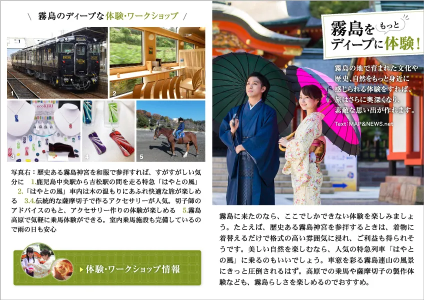 歴史ある霧島神宮を参拝するときに着物に着替えたり、美しい自然を楽しむために人気の特急列車「はやとの風」に乗ってみたり。その他、高原での乗馬や薩摩切子の製作など、霧島らしさをより深く楽しめる体験やワークショップを紹介します。