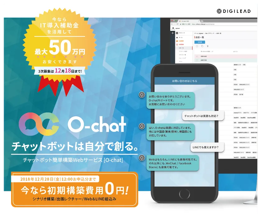 株式会社デジリード(所在地:東京都新宿区、代表取締役:大坪 敏雄)は、チャットボット簡単構築プラットフォーム「O-chat」の年内導入について、シナリオ構築など初期構築費用50万円分が無料になる、今だけおトクなキャンペーンをスタート致します。
