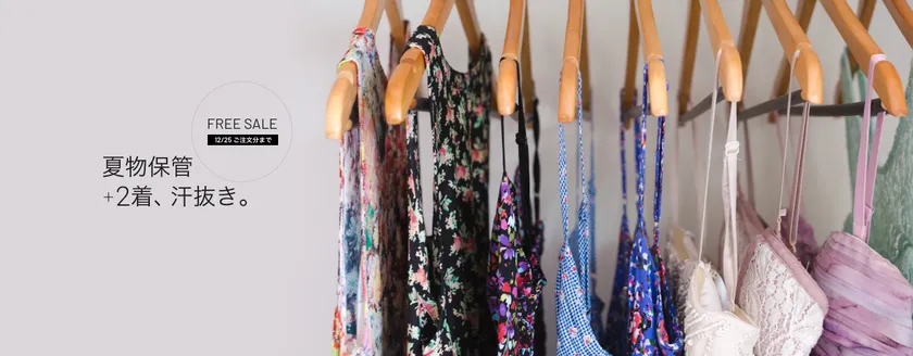 保管パックをご注文1パックにつきプラス2着と夏物衣類のメンテナンスに必須の汗抜きを無料サービスいたします。キャンペーンは12月25日のご注文分までとなります。